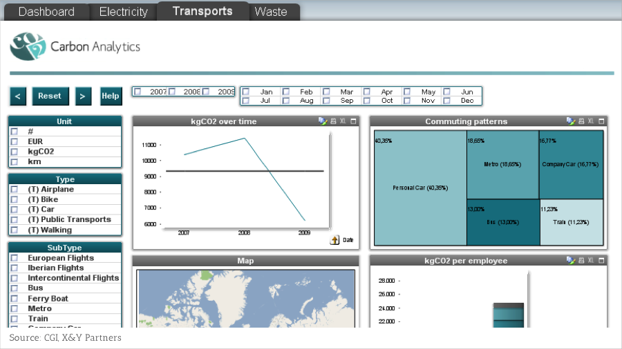 Carbon Analytics is a real-time carbon emissions monitoring and analysis system. It uses measuring hardware (e.g. energy consumption meters, GPS tracking devices) and business intelligence software to measure and analyze in real-time the carbon footprint of an entire company, automatically reporting the results and suggesting ways to improve them (Exhibit 1).